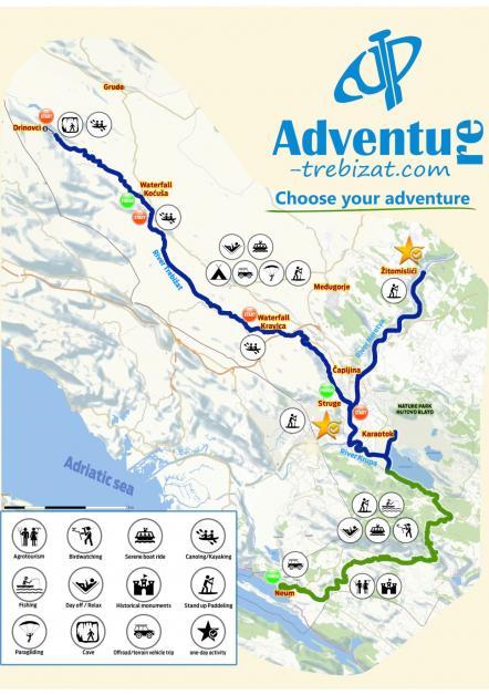 Zapocnite vodenu avanturu Trebižatom kupanjem na predivnim slapovima Kravica, sedrenoj barijeri koja tvori slap visok 25 m. Zatim iskusite jedan od najvecih adrenalinskih izazova na Trebižatu spust niz malu Kravicu iza cega slijedi uživanje u mirnijem toku kroz netaknuti krajolik do pauze za rucak. Okrijepljeni domacim proizvodima nastavljate vodenu avanturu dugu 15 Km, koja u drugoj polovini puta postaje ispresijecana brzacima. Avantura sastavljena od niza uzbudljivih lokacija, u kojima imate priliku iskušati i unaprijediti svoje reflekse i izdržljivost, užitka u prirodi i gastronomskih delicija. Izlet pruža mogucnost pojedinacnog spusta niz brzace visine 3 m za one koji žele iskusiti punu snagu Trebižata, te siguran zaobilazak za one bez prethodnog iskustva na vodi.